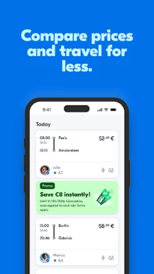 Para quem procura viajar, BlaBlaCar abre um mundo de possibilidades à sua espera. Navegue por uma infinidade de destinos e descubra percursos que o levam exatamente onde precisa, muitas vezes com pontos de encontro convenientemente próximos. Garanta o seu lugar com facilidade – pode reservar instantaneamente ou solicitar um assento – e desfrute de viagens acessíveis que o aproximam do seu ponto final, com a flexibilidade de encontrar soluções quase "porta a porta".