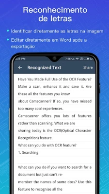 Confiado por mais de 750 milhões de utilizadores em todo o mundo, CamScanner redefine a experiência de digitalização. Converta o seu dispositivo numa potente ferramenta portátil, com capacidade de reconhecimento automático de texto, elevando a sua produtividade tanto no trabalho como na vida quotidiana. Diga adeus à papelada com esta solução rápida e eficiente, que permite capturar, organizar e armazenar documentos em formatos versáteis como PDF, JPG, Word e TXT, transformando o seu telefone num verdadeiro escritório móvel.