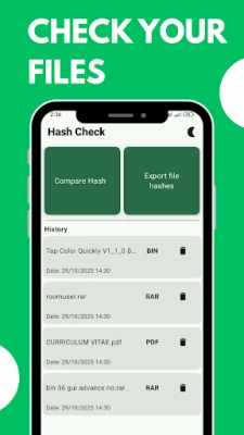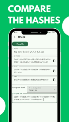 Com **HashCheck**, o processo é simplificado e seguro. Selecione qualquer item do seu dispositivo – desde um PDF crucial a um instalador de software ou um APK – e obtenha instantaneamente o seu "DNA digital" através do cálculo do hash SHA-256. Precisa de comparar? Basta introduzir ou colar o código de verificação esperado, e a aplicação informará se os valores correspondem. Para além do padrão recomendado SHA-256, a ferramenta oferece suporte para SHA-1 e MD5, garantindo compatibilidade para diversas necessidades. Tudo isto é processado integralmente no seu aparelho, sem qualquer upload de dados, garantindo total privacidade e controlo sobre as suas informações.
