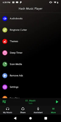 Vá além do básico com Hash Music Player. Este não é apenas um reprodutor de MP3; é uma plataforma completa que enriquece sua jornada auditiva. Mergulhe nas letras de suas músicas favoritas, transforme trechos específicos em toques de chamada personalizados com o cortador de áudio integrado e compartilhe faixas com amigos próximos de forma instantânea, sem a dependência da internet. Para os aficionados por narrativas, o suporte robusto a audiolivros facilita a organização e reprodução de arquivos longos, com ferramentas otimizadas para acompanhar cada capítulo da sua história.