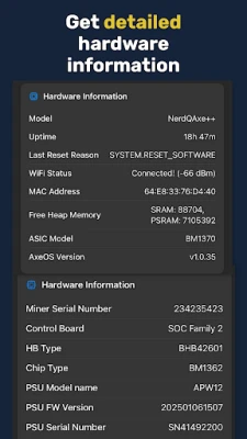 Vá além do monitoramento passivo com as funcionalidades avançadas de HashWatcher. Receba alertas inteligentes de temperatura, notificando-o imediatamente quando os chips excederem limites definidos, prevenindo problemas antes que se agravem. Utilize as robustas ferramentas de manutenção para planejar serviços, exportar relatórios diários em PDF para auditorias e registros impecáveis, facilitando a gestão da sua energia e a passagem de turno da equipe. A interface intuitiva, construída com uma abordagem "fleet-first", escala perfeitamente de um único minerador para toda uma frota. Compatível com mineradores Braiins OS (como a série Antminer S19/S21), dispositivos BitAxe NerdQAxe e outras linhas suportadas, sua privacidade é garantida: os dados são acessados diretamente dos seus dispositivos, sem nuvens de terceiros.