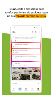 Com Trello, você ganha a liberdade de criar painéis personalizados, servindo como telas visuais para qualquer empreendimento. Trabalhe de forma independente, desfrutando de uma central de comando pessoal, ou convide colegas, amigos e familiares para uma colaboração fluida e em tempo real. Adapte fluxos de trabalho específicos para cada projeto, garantindo que cada etapa seja clara e gerenciável. Adicione listas de verificação detalhadas a cada cartão, atribua responsabilidades e interaja por meio de comentários, garantindo que todos estejam na mesma página e que o progresso seja contínuo.