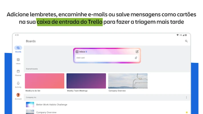 Trello proporciona uma visão completa dos seus projetos, seja no trabalho ou em casa. Organize tarefas, acompanhe o progresso e colabore de forma eficiente para gerenciar tudo com clareza e facilidade.